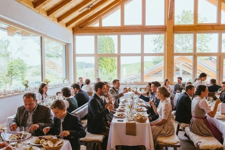 Im Stadl selbst begleiten wir Hochzeiten dann oft vom Dinner bis zur ausgelassenen Feier am Abend. Mit Platz für rund 150 Gäste, großem Panoramafenster und barrierefreiem Zugang bietet die Location beste Voraussetzungen für eine stilvolle Feier mit Livemusik, Tanzmusik am Nachmittag und später einer vollen Tanzfläche. Durch die verschiedenen Bereiche lässt sich der Tag sehr natürlich aufbauen, ohne dass die Feier an Charakter oder Stimmung verliert.